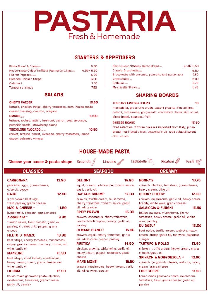 The menu at Pastaria is a beautifully crafted mix of traditional Italian and contemporary cuisines. It starts with tempting starters like the Tuscany Tasting Board and halloumi, enticing guests to explore further. The salad offerings, including the Chef's Caesar, bring freshness and balance to the meal.